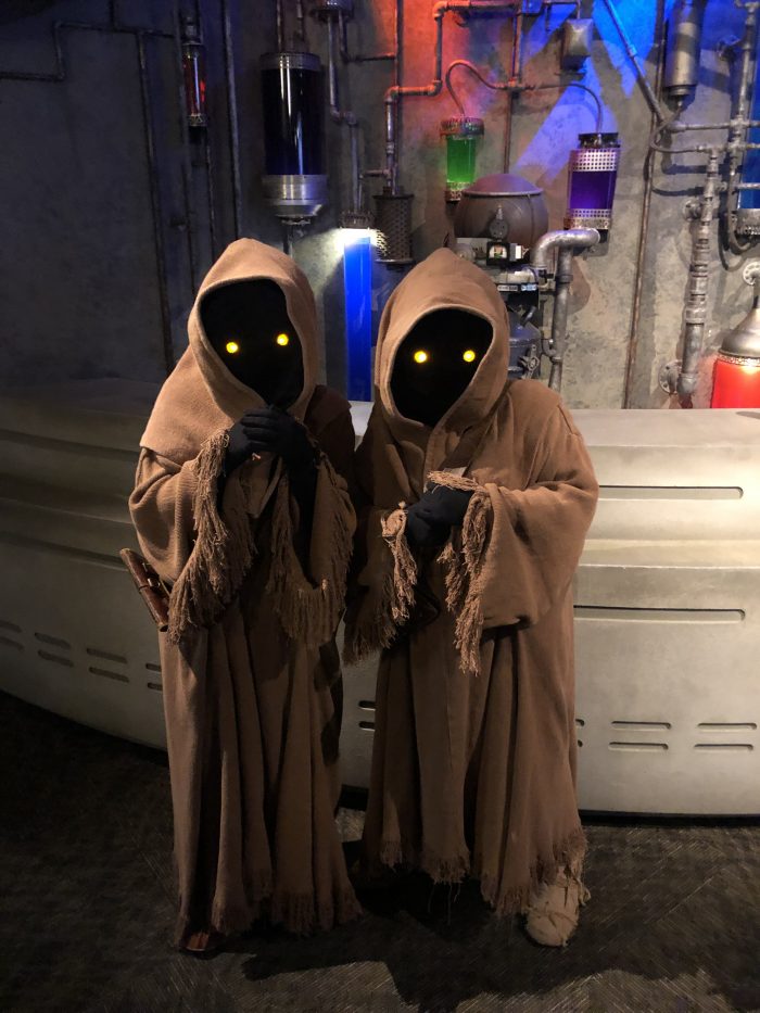 After hours on Star Wars Day meant that Star Wars characters were out in full force (or Force, if you’ll forgive the pun). In the Animation Courtyard, there were all sorts of droids rolling around, including a mouse droid and R2-D2 himself. Rogue One’s black Death Troopers were also there and there was a black, C-3PO-esque protocol droid, possibly meant to be the character 0-0-0 from the comics. Inside Star Wars Launch Bay, the usual characters like Kylo Ren and Chewbacca were joined in new pairings at their meet-and-greet spots by Captain Phasma and Rey. Darth Vader was on hand, as well, and we got photos of a couple of rare Jawas in front of the Cantina bar counter.